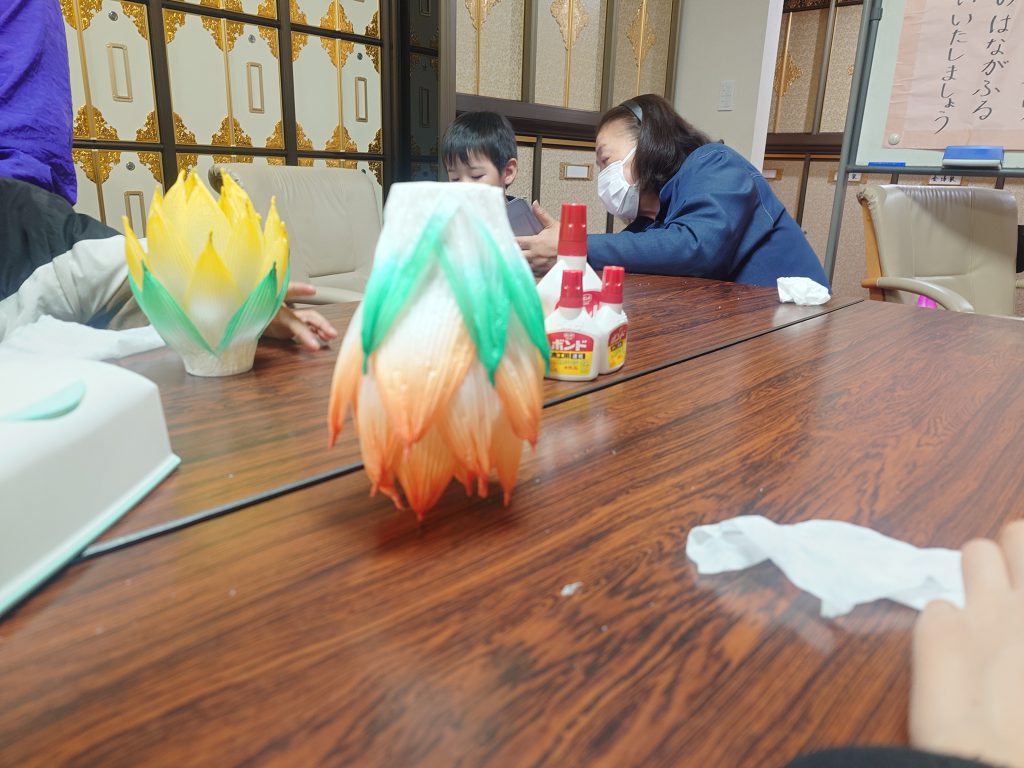 子どもたちの参加者は決して多いとは言えませんでしたが、それでも紙芝居に夢中になり、蓮の花作りで苦労をしながらも素晴らしい花を完成させ、カレーに喜びの顔を、甘茶には微妙な顔をみせてくれました。